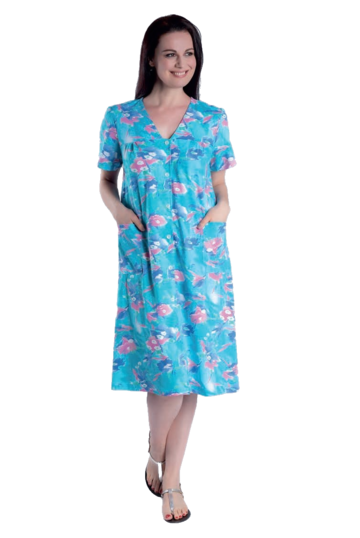 Abito prendisole a maniche corte, scollo a V, chiusura a bottoni e tasche frontali, realizzato in jersey di cotone 100%.Disponibile nelle taglie 46 – 48 – 50 – 52 – 54 – 56 – 58 – 60 in fantasie assortite. La scelta della fantasia e del colore dipenderà dalla disponibilità del momento.