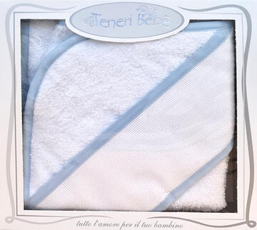 Accappatoio Teneri Bebè a triangolo con spazio da ricamare.Disponibile in taglia unica con il bordino nei colori bianco, cielo, giallo, rosa e verde.
