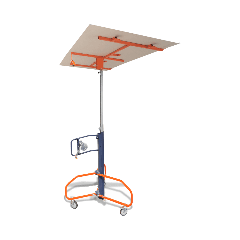 Tre ruote di cui due ruote con freno. Innovativo sistema frenante con due maniglie (freno principale + freno di sicurezza) per abbassare il pannello rapidamente sotto controllo. Lavoro automatico grazie all’assistenza. Sistema a cremagliera che limita gli sforzi di sollevamento. Non produce alcun rumore durante l’attività.