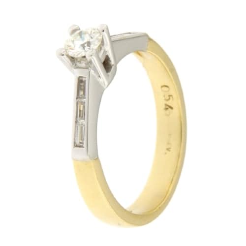 Anello Donna Oro Giallo Bianco GL101472 Anello da donna in oro giallo e bianco 18 kt (750/00). Anello modello solitario con 7 diamanti naturali, 0.54 carati totali, taglio brillante e baguette, colore G, purezza VS. Il peso dell’anello è di 5.10 grammi. Referenza: GL101472