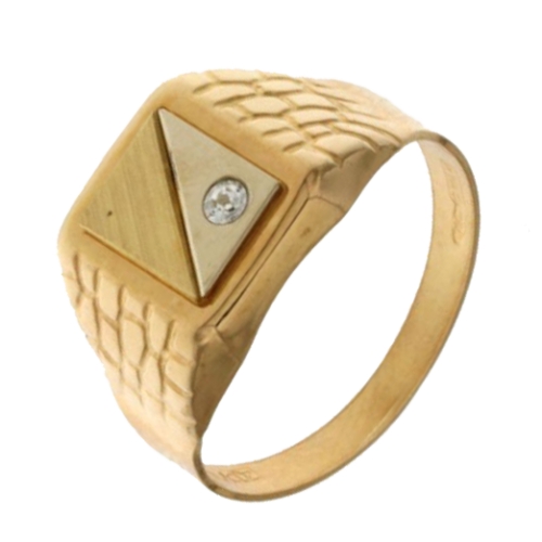 Anello da uomo in oro giallo 750/00 (18 kt), forma rettangolare con lavorazione lucida e satinata, pietra zircone, dimensioni piastra cm 0,70 x 0,90, peso 3,60 grammi. Referenza: 803321711968