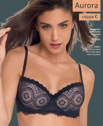 Balconconcino tutto in pizzo con ferretto ed imbottiture preformate sviluppato in coppa C (abbondante)Taglie: 3 – 4 – 5 – 6 Coppa C