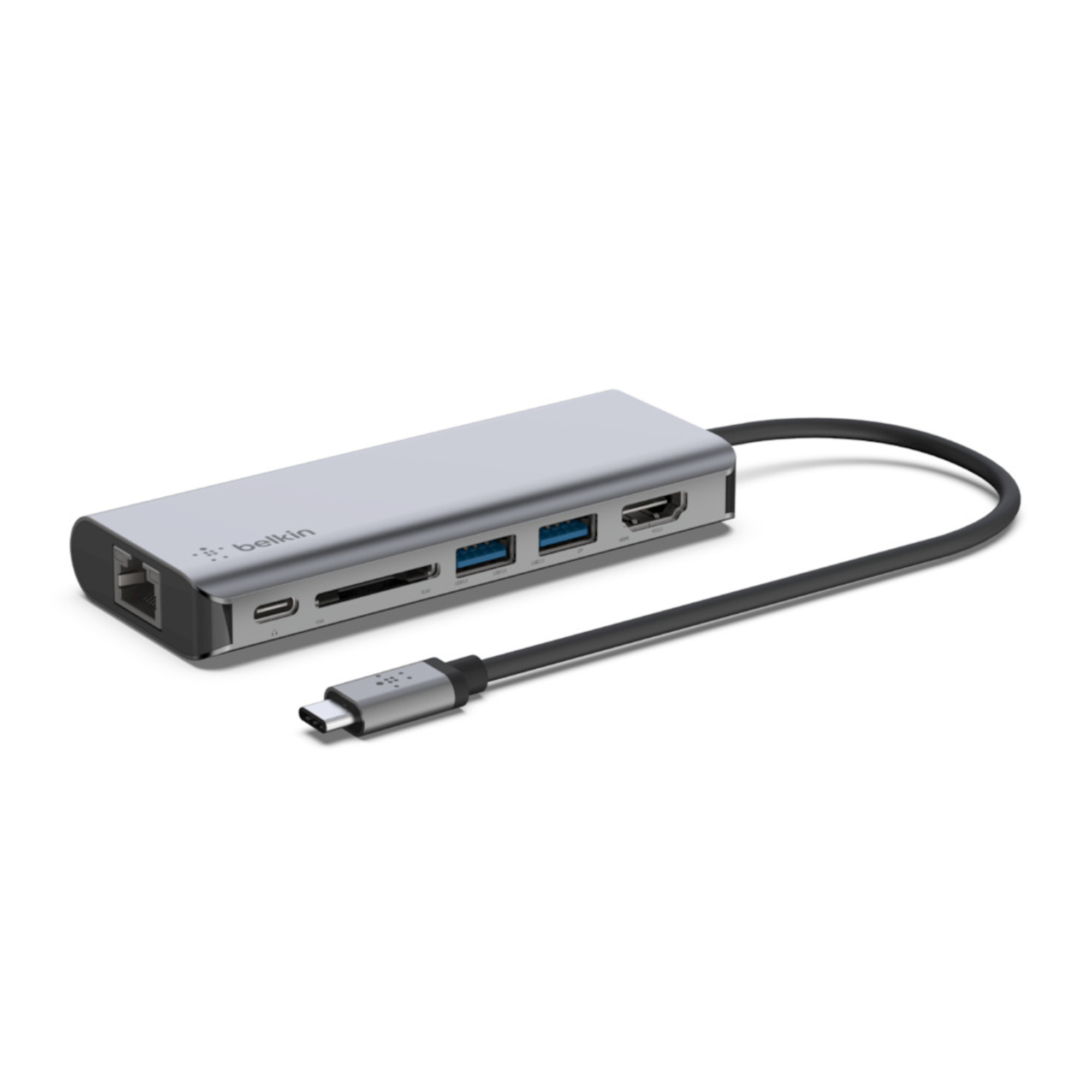 Belkin AVC008BTSGY. Interfaccia host: USB 3.2 Gen 1 (3.1 Gen 1) Type-C, USB Power Delivery fino a: 100 W. Colore del prodotto: Nero, Grigio, Schede di memoria compatibili: SD, Interfacce hub: HDMI, RJ-45, USB 3.2 Gen 1 (3.1 Gen 1) Type-A, USB 3.2 Gen 1 (3.1 Gen 1) Type-C. Larghezza: 117 mm, Profondità: 16 mm, Altezza: 47 mm – Prodotto nuovo