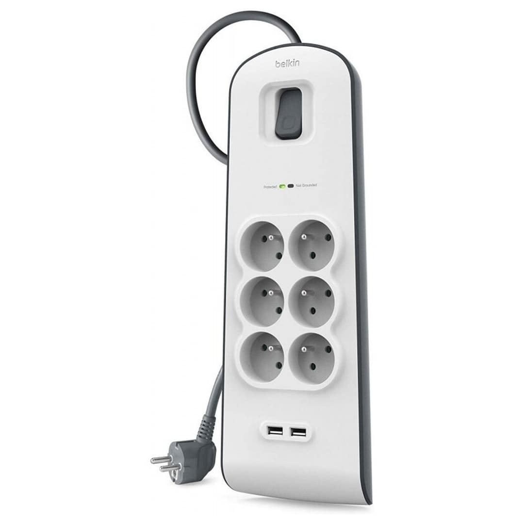 Belkin – BSV604ca2M – Multi Outlet/Lightning Arrester 6 uscite con 2 porte USB integrate – Cavo da 2 m – Bianco (Protezione fino a 650 joule) – nuovo