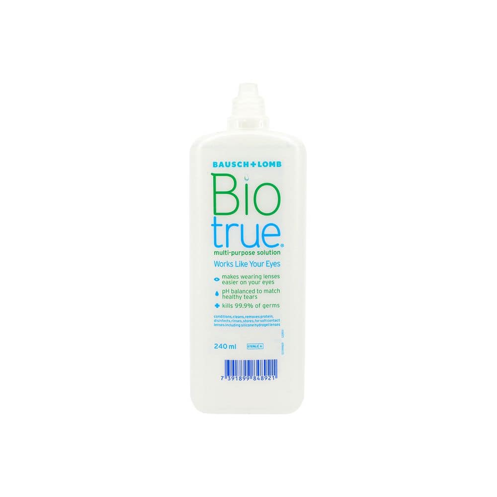 Questo Biotrue Flat Pack include un flacone da 240 ml di soluzione multiuso Bausch & Lomb per risciacquare, pulire e conservare le lenti a contatto quando non le utilizzi.La soluzione Biotrue per lenti a contatto assicura che i tuoi occhi rimangano sani e sempre idratati, replicando il naturale livello di pH delle lacrime.Mantenendo attive le proteine e i fluidi importanti, le possibilit� di irritazione si riducono notevolmente quando si indossano lenti a contatto. Pulire e conservare correttamente le lenti riduce le probabilit� di contrarre infezioni oculari.Questo flacone si adatta alla maggior parte delle cassette delle lettere, pertanto facilita la spedizione.