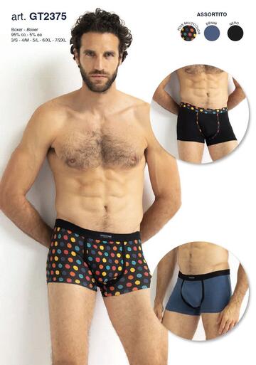 Boxer uomo in cotone elasticizzato vita bassa con logo nell'elastico.ASSORTIMENTO: 2 Nero + 2 Pois multicolor + 2 DenimTaglie: 3/S – 4/M – 5/L – 6/XL – 7/XXL