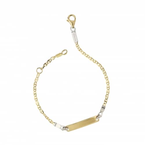 Bracciale Bimbi Oro Bianco Giallo GL101603 Bracciale da bambini in oro giallo 750/00 (18 kt). Bracciale a catena con targhetta personalizzabile con incisione. La lunghezza del bracciale è regolabile da 12 a 14 cm. Il peso del bracciale è di 1.60 grammi. Referenza: GL101603