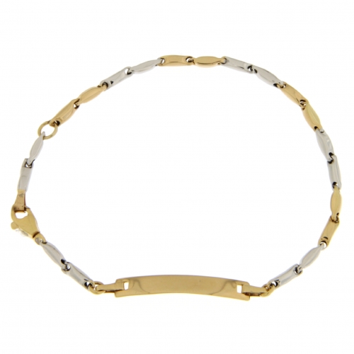 Bracciale Bimbi Oro Bianco Giallo GL101802 Bracciale da bambini in oro bianco e giallo 750 (18 KT). Bracciale a catena tubolare con targhetta personalizzabile, dimensione targhetta 2.10 x 0.40 cm. La lunghezza del bracciale è regolabile da 14 a 16 cm. Il peso del bracciale è di 2.90 grammi. Referenza: GL101802