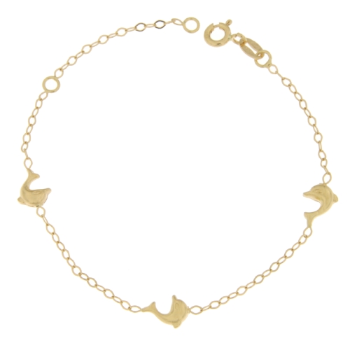 Bracciale Bimbi Oro Giallo GL100867 Bracciale per bambini in oro giallo 18 kt (750/00). La maglia del bracciale è a catena alternata ad elementi a forma di delfino. La lunghezza del bracciale è regolabile tramite anellini da 14 a 17 cm. La chiusura del bracciale è con moschettone. Il peso del bracciale è di 1.70 grammi. Referenza: GL100867