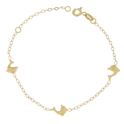 Bracciale Bimbi Oro Giallo GL100867 Bracciale per bambini in oro giallo 18 kt (750/00). La maglia del bracciale è a catena alternata ad elementi a forma di delfino. La lunghezza del bracciale è regolabile tramite anellini da 14 a 17 cm. La chiusura del bracciale è con moschettone. Il peso del bracciale è di 1.70 grammi. Referenza: GL100867
