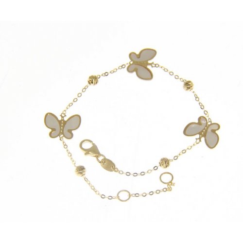 Bracciale da bambina in oro giallo 750/00 (18 kt) con farfalle in madreperla, lunghezza regolabile da 14 a 16 cm, peso 2,30 grammi. Referenza: 176705 Idea regalo per battesimo o comunione.