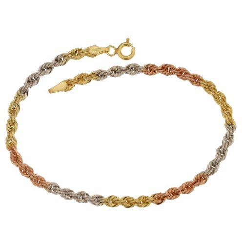 Bracciale da donna a tre colori in oro giallo,bianco e rosa 750/00 (18 kt), maglia fune laser, lunghezza 19 cm, peso 2.90 grammi. Referenza: 803321704538 Non è quello che cercavi? Scopri tutti i bracciali da donna in oro o i nostri gioielli in oro