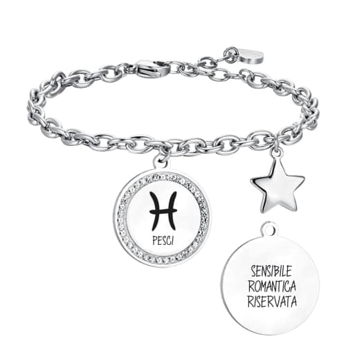 Bracciale Donna Luca Barra BK2552 Bracciale donna in acciaio con piastra con smalto nero e cristalli bianchi. Segno zodiacale “Pesci”. Lunghezza: 16 + 3 cm. Diametro piastra: 20 mm. I Pesci sono spesso associati a qualità come la profondità emotiva, la comprensione e la compassione. Indossare un bracciale che rappresenta il proprio segno zodiacale può avere un significato personale, come un modo per esprimere la propria identità e connessione con le qualità tipiche dei nativi dei Pesci. Referenza: BK2552 Articolo spedito con garanzia ed astuccio originale Luca Barra