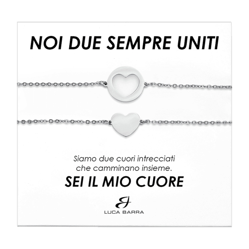 Bracciale Donna Luca Barra BK2576 Bracciali Donna in acciaio con cuori. Lunghezza: 16 + 3,5 cm. Misura cuore pieno: 15 x 11 mm. Misura cuore traforato: 17 x 14 mm. Celebra la tua amicizia speciale con questa coppia di bracciali. Questi bracciali rappresentano un legame profondo e significativo, con ciascun cuore che racconta la propria storia. Referenza: BK2576 Articolo spedito con garanzia ed astuccio originale Luca Barra