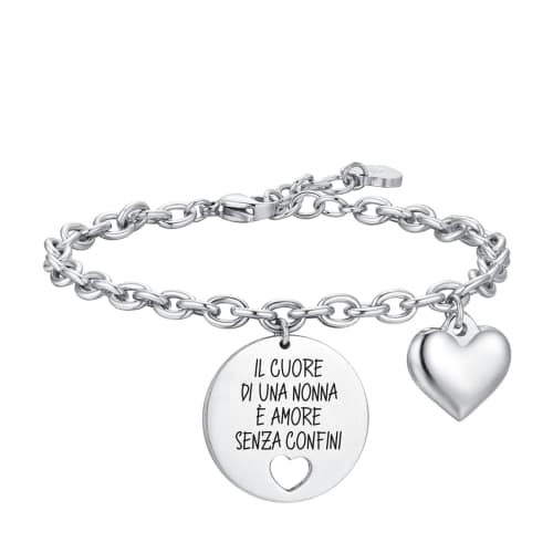 Bracciale Donna Luca Barra BK2643 Bracciale Donna in acciaio Il cuore di una Nonna è Amore senza confini. Lunghezza: 16,5 + 3 cm. Diametro piastra: 20 mm. Spessore catena: 4 mm. Il cuore di una Nonna è Amore senza confini. Con ogni gesto, ogni sorriso, ogni abbraccio, hai riempito le nostre vite di calore e gentilezza. Questa frase esprime amore e riconoscimento per il ruolo unico e prezioso che le nonne hanno nelle vite dei loro nipoti. È un modo speciale per dimostrare gratitudine e affetto. Il cuore è un simbolo universale dell’amore e l’affermazione sottolinea la natura senza limiti dell’affetto di una nonna. Il bracciale diventa così un simbolo tangibile di questo amore duraturo. Referenza: BK2643 Articolo spedito con garanzia ed astuccio originale Luca Barra