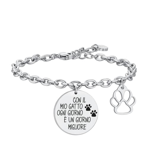Bracciale Donna Luca Barra BK2647 Bracciale Donna in acciaio Con il mio gatto ogni giorno è un giorno migliore. Lunghezza: 16,5 + 3 cm. Diametro piastra: 20 mm. Spessore catena: 4 mm. Con il mio gatto ogni giorno è un giorno migliore: rappresenta un tributo affettuoso alla compagnia e al conforto che gli animali domestici, in questo caso il gatto, portano nella vita di chi li ama. Acquistare un regalo che celebra la compagnia del proprio gatto è un atto di autocura e benessere. Rappresenta l’importanza di prendersi cura di sé stessi e di cercare il conforto e la gioia nelle piccole cose della vita quotidiana. Referenza: BK2647 Articolo spedito con garanzia ed astuccio originale Luca Barra