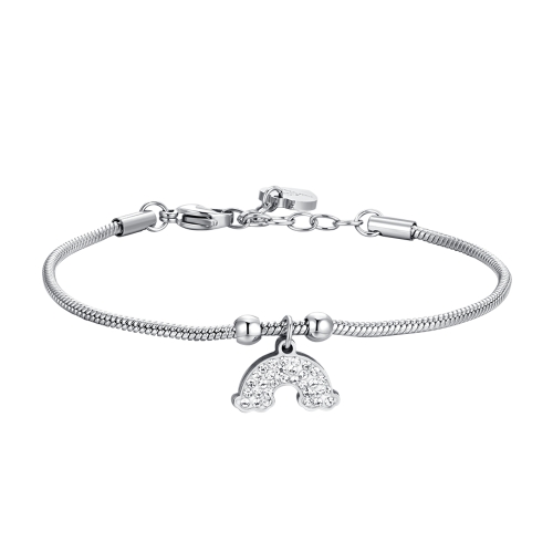 Bracciale Donna Luca Barra BK2658 Bracciale Donna in acciaio con arcobaleno con cristalli bianchi. Lunghezza: 16,5 + 3 cm. Misura ciondolo: 14 x 9 mm. Spessore catena: 2 mm. L’arcobaleno appare dopo la pioggia e simboleggia la speranza e l’ottimismo. Il bracciale rappresenta la luce che segue i momenti bui e un ricordo che le cose migliori possono venire dopo i periodi difficili. L’arcobaleno è composto da una varietà di colori che si fondono insieme in armonia. Il bracciale simboleggia la ricerca della pace e dell’armonia nel mondo e nelle relazioni umane. Referenza: BK2658 Articolo spedito con garanzia ed astuccio originale Luca Barra