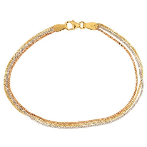 Bracciale Donna Oro Giallo Bianco Rosa GL100829 Bracciale da donna in oro giallo, bianco e rosa 750/00 (18 kt). La maglia del bracciale è a 3 fili. La lunghezza del bracciale è regolabile di 19 cm. Il peso del bracciale è di 3.40 grammi. Referenza: GL-G21718112