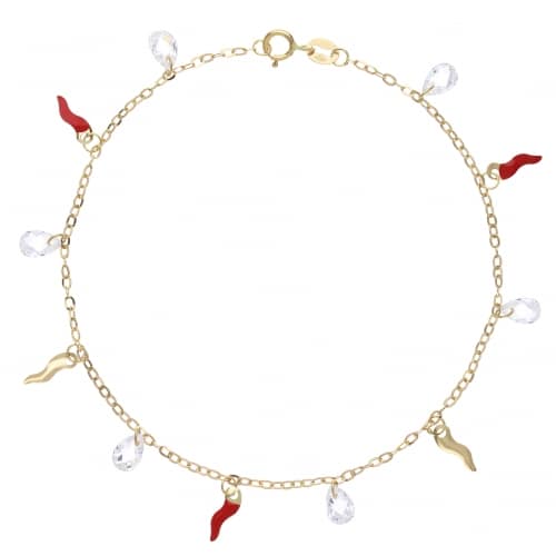 Bracciale Donna Oro Giallo GL101495 Bracciale da donna in oro giallo 750/00 (18 kt). Bracciale a catena con pendenti a forma di cornetto portafortuna e pietre zirconi. La lunghezza del bracciale è di 19 cm. Il peso del bracciale è di 1.50 grammi. Referenza: GL101495