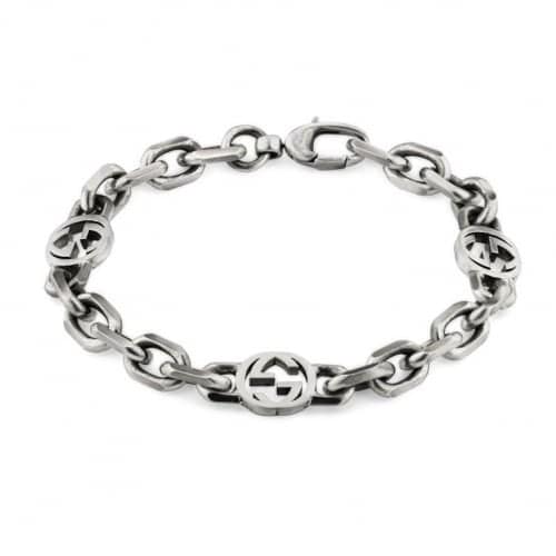 Bracciale Gucci Interlocking G YBA620798001 Bracciale unisex Gucci in argento 925 della collezione Interlocking G. Referenza: YBA620798001 Realizzato in argento con finitura invecchiata, questo bracciale a catena è definito dall’Interlocking G. Simbolo degli archivi della Maison, il dettaglio del monogramma rende omaggio al fondatore del marchio, Guccio Gucci, aggiungendo una sottile connotazione del logo. Articolo spedito con astuccio originale Gucci
