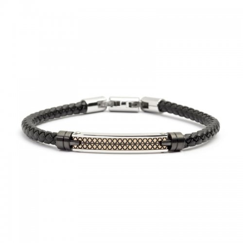 Bracciale uomo Marlù Gioielli in pelle nero 4mm e targa in acciaio con inserti in smalto nero con doppia chiusura, 21 cm regolabile Collezione Man Class. Referenza: 4BR1809NR