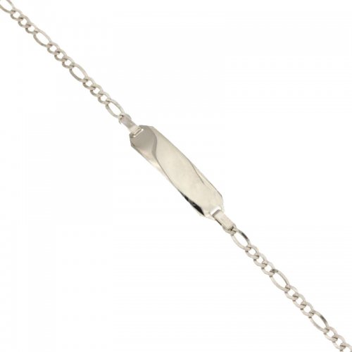 Bracciale da bimbi in oro bianco 750/00 (18 kt) con targhetta, lunghezza 14 cm, targhetta ovale 0,60 x 2,30 cm, pesso 2,30 grammi. Referenza: 803321707342 Possiamo incidere gratuitamente la targhetta con nome, data o qualsiasi altra cosa; inserisci il testo da incidere nel campo commenti, durante la procedura d’ordine. Idea regalo per battesimo o comunione.