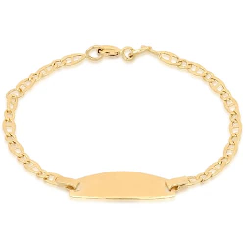 Bracciale da bimbi in oro giallo 750/00 (18 kt) con targhetta, lunghezza 14 cm, targhetta ovale 0,60 x 2,10 cm, peso 1.70 grammi. Referenza: 803321720611 Idea regalo per battesimo o comunione.
