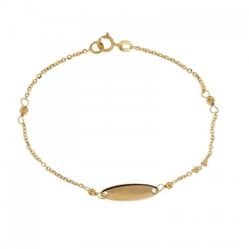 Bracciale per bimbi in oro giallo 750/00 (18 kt) con targhetta, lunghezza 14 cm, targhetta ovale 1,50 x 0,50 cm, peso 1,70 grammi. Referenza: 803321730051 Possiamo incidere gratuitamente la targhetta con nome, data o qualsiasi altra cosa; inserisci il testo da incidere prima di aggiungere al carrello. Idea regalo per battesimo o comunione.
