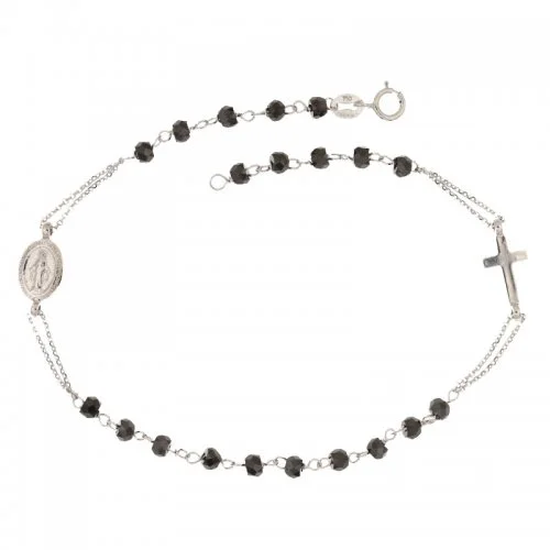 Bracciale rosario unisex in oro bianco 750/00 con grani pietre nere, dimensione pietre cm 0,25, dimensione pendente Madonna mm 6 x 8, dimensione croce mm 6 x 10, lunghezza 18 cm, peso 2,80 grammi. Referenza: 803321736933 Il bracciale sarà spedito nella confezione della nostra gioielleria, con certificato di autenticità.