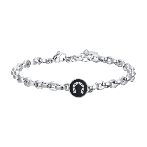 Bracciale Uomo Luca Barra BA1824 Bracciale Uomo in acciaio con ferro di cavallo con smalto nero. Lunghezza: 19 + 3 cm. Misura elemento: 10 x 3 mm. Spessore maglia: 5 mm. Aggiungi un tocco di fortuna al tuo stile con questo distintivo bracciale da uomo in acciaio, caratterizzato da un affascinante ferro di cavallo al centro. Riconosciuto come simbolo di buona sorte e protezione, il ferro di cavallo è accentuato da dettagli in smalto nero, creando un contrasto elegante e moderno. Questo bracciale non solo è un accessorio di moda, ma porta con sé un significato speciale. Referenza: BA1824 Articolo spedito con garanzia ed astuccio originale Luca Barra