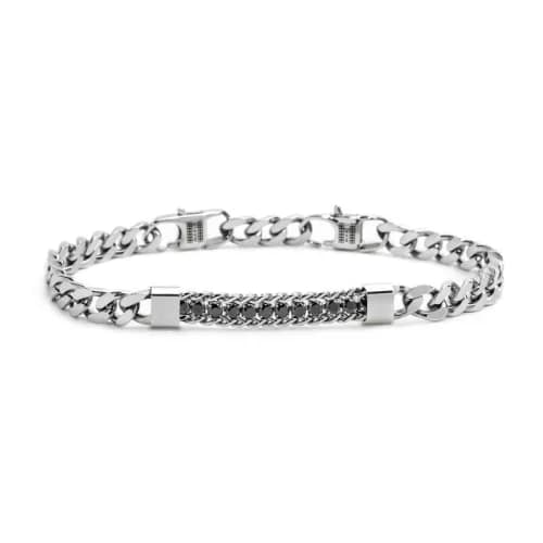 Bracciale Uomo Marlù 31BR0004-N Bracciale in acciaio con catena a grumetta con spessore 5,9 mm, con centrale a triplo filo con catena tennis con cubic zirconia neri e con catena grumetta sui lati. Lunghezza totale 21 cm, regolabile da 21 a 19,5 cm tramite catena grumetta removibile. Referenza: 31BR0004-N Articolo spedito con astuccio Marlù