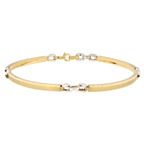Bracciale Uomo Oro Giallo Bianco GL101238 Bracciale da uomo in oro giallo e bianco 750/00 (18kt). La maglia del bracciale è semirigida. La larghezza massima della maglia è di 0.40 cm. La lunghezza del bracciale è di 20 cm. Il peso del bracciale è di 6.70 grammi. Referenza: GL101238