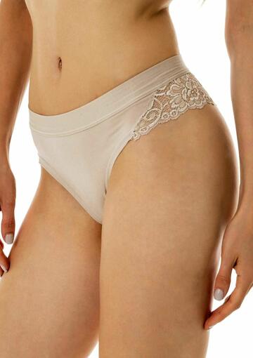 Brasiliana in morbido micro-modal elasticizzato con balza di pizzo che prosegue dietro.Made in Italy.Taglie: 2/S – 3/M – 4/L – 5/XL