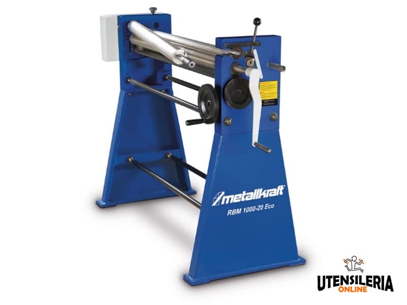 Calandra a 3 rulli asimmetrici Metallkraft modello RBM 1000-20 ECO ad azionamento manuale, per la calandratura di lamiere metalliche con una larghezza massima di 1050 mm. Costruzio