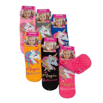 Calzino antiscivolo da bambina in spugna di cotone, con polsino elasticizzato, gommini antiscivolo e fantasia unicorno con dettagli in lurex.Taglie: 2/4(22/26), 4/6(27/30), 6/8(31/34), 10/12(35/39)
