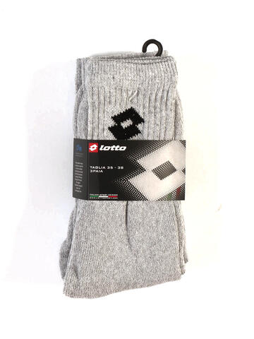 Calzini uomo e donna in spugna di Lotto; art. Tennis.Confezione da 3 paia.Disponibile nelle taglie 36-38, 39-42, 43-46 nei colori bianco, nero e grigio.