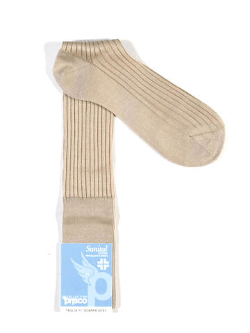 Calzini lunghi da uomo a costine di Prisco; art. Sanital Lungo cotone.Calza realizzata in cotone e rimagliata a mano. Attenzione al polsino: la particolarissima lavorazione del cotone, che esclude l'uso delle fibre elastiche, fa di questa calza un modello consigliato dai medici alle persone con disturbi circolatori.Disponibile nelle taglie 10,5 (39/40) – 11 (40/41) – 11,5 (41/42) – 12 (42/43) – 13 (44/45) nei colori bianco, nero, blu, beige, marrone e grigio perla.