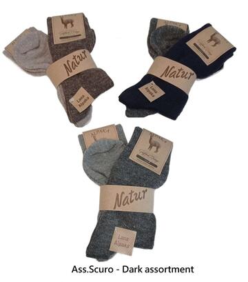 Calzino corto da donna a maglia liscia e da uomo a coste in calda lana d'Alpaca elasticizzata tinta unita melange. 2 PAIAMade in ItalyTAGLIA UNICA DONNA 35/39TAGLIA UNICA UOMO 40/45