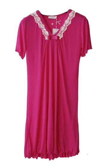 Camicia da notte donna a maniche corte in jersey di viscosa con pizzo e fiocco in raso. Made in ItalyTaglie: M – L – XL – XXL e nei colori Fucsia e Bluette