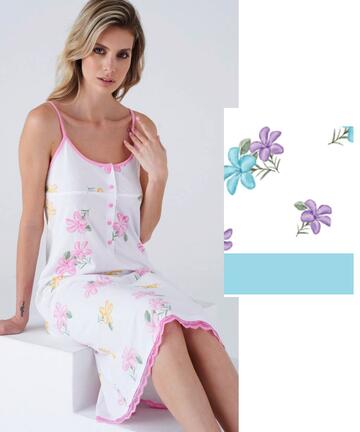 Camicia da notte a spallina stretta in jersey di cotone fantasia con profilo in pizzo, apertura a serafino.Taglie: M – L – XL – XXL