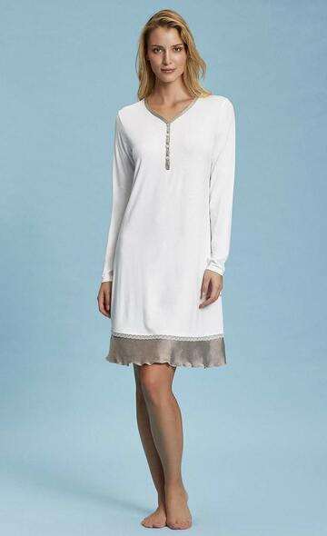 Camicia da notte a manica lunga in jersey di viscosa con inserti in raso fantasia, profilo in pizzo e apertura a serafino.Made in Italy.COLORI: NATURALE (foto) e GRIGIO PERLATaglie: 3/M – 4/L – 5/XL – 6/XXL
