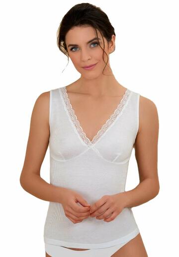 Canotta donna Antonella spalla larga, in lana cotone con forma del seno con profilo in pizzo elasticizzato.Taglie dalla 4 alla 8. Colore solo bianco.