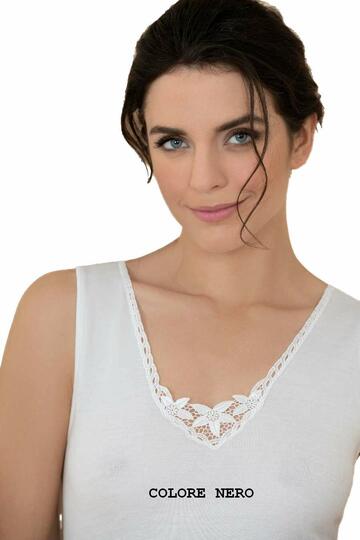 Canottiera donna a spalla larga in misto-lana all'esterno e puro cotone sulla pelle con pizzo macramè.Taglie da 3 a 7. Colore Nero