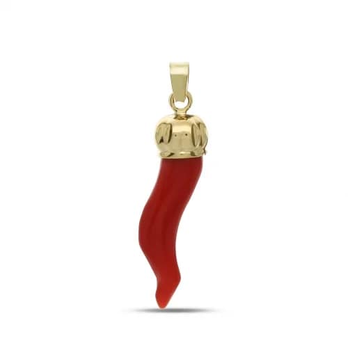 Ciondolo Corno Napoletano Oro Giallo GL101816 Ciondolo unisex in oro giallo 750/00 (18 kt). Ciondolo a forma di corno napoletano con corallo rosso, dimensioni 2.30 x 0.60 cm. Il peso del ciondolo è di 1.10 grammi. Referenza: GL101816