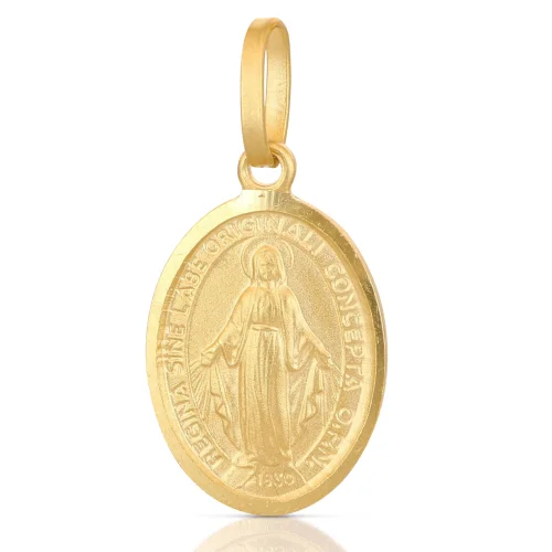 Ciondolo unisex in oro giallo 750/00 (18kt), coniato con l’immagine della Madonna Miracolosa, lavorazione lucida e satinata, dimensioni 1,10 x 1,50 cm, peso 1,90 grammi. Referenza: 803321707034