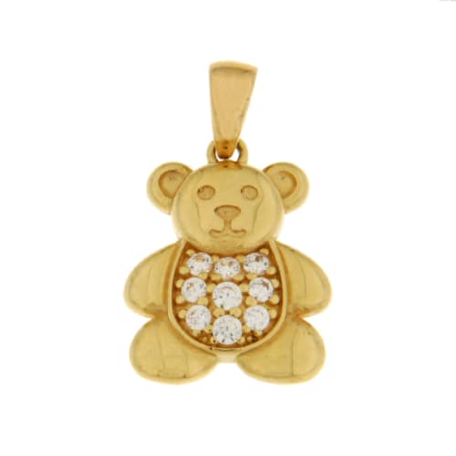 Ciondolo Orsacchiotto Oro Giallo GL102023 Ciondolo da donna in oro giallo 750 (18 KT). Ciondolo a forma di orsacchiotto Teddy con pietre zirconi, dimensioni 1,60 x 1,00 cm, peso 1,70 grammi. Referenza: GL102023 Questo tenerissimo ciondolo a forma di orsacchiotto Teddy, realizzato in oro giallo 18 kt e impreziosito da brillanti zirconi, è il simbolo perfetto di amore e protezione. Un regalo dal cuore tenero, capace di evocare ricordi speciali e momenti indimenticabili.