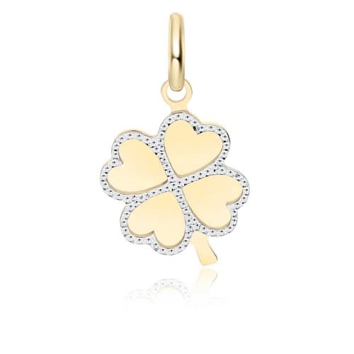 Ciondolo portafortuna unisex a forma di quadrifoglio in oro giallo e bianco 750/00 (18kt), lavorazione lucida e puntinata, dimensioni 1,40 x 1,60 cm, peso 1.10 grammi. Referenza: 803321731481 Non è quello che cercavi? Scopri tutte i ciondoli in oro o i nostri gioielli in oro