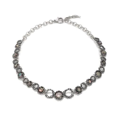 Collana Donna Giovanni Raspini Mini Maui 10680 Collana da donna Giovanni Raspini in argento 925, madreperla e quarzo ialino, Lunghezza catena 42 cm regolabile, Chiusura con moschettone. Referenza: 10680 I sofisticati colori dell’alba riflessa sul grande oceano e la sapiente scelta di materiali hanno ispirato questa collana, connubio perfetto tra argento brunito e madreperla. I riflessi cangianti, in contrasto con l’effetto chiaroscurale della finitura brunita, impreziosiscono il collo di una donna elegante. Indossala con gli orecchini modello bottone della stessa collezione per una straordinaria dichiarazione di stile. Articolo spedito con astuccio originale Giovanni Raspini