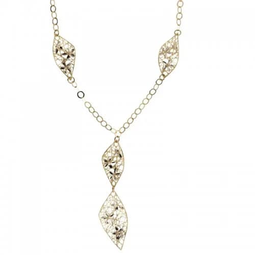 Collana girocollo da donna in oro giallo 18 kt (750/00), catenina maglia rolo ovale con elementi a foglia, lavorazione traforata e martellata, lunghezza 45 cm, peso 7,00 grammi. Referenza: 803321727016 La collana sarà spedita nella confezione della nostra gioielleria, con certificato di autenticità.