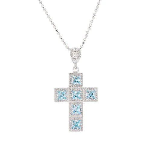 Collana Donna Michele Affidato Trinity CL-TY-000582 Collana da donna Michele Affidato della collezion Trinity. Collana con croce in argento 925 con pietre zirconi di colore azzurro. Lunghezza collana regolabile da 42 a 45 cm. Referenza: CL-TY-000582 Catenina con croce in argento 925, realizzata con la tecnica della fusione a cera persa e rifinita artigianalmente. Una creazione composta da sei castoni finemente lavorati e circondati da una greca a rilievo a forma di ondina. In ogni elemento sono state incastonate pietre di Cubic Zirconia, taglio princess. Articolo spedito con garanzia e astuccio Michele Affidato